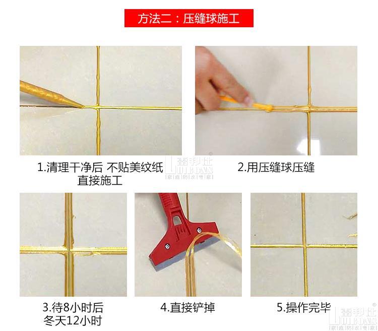 ⊙施工50-100厘米后,用壓縫球輕輕壓實,然后用刮板將多余額美縫膠刮掉,如果沒有貼美縫紙,那在刮好后要用濕海綿擦拭干凈。
